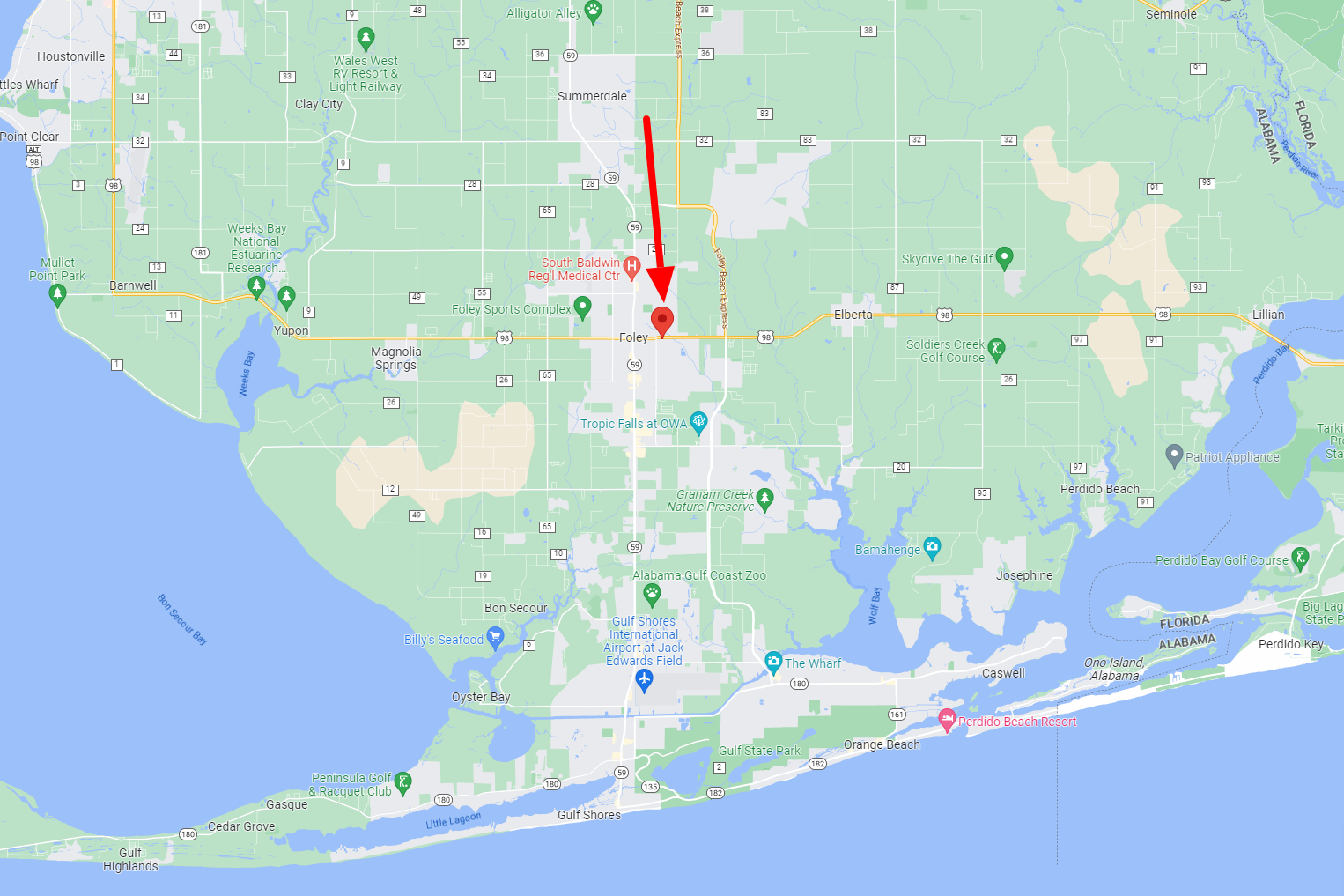 Located on Foley’s major East-West corridor known as Laurel Avenue/US Route 98/Alabama’s Coastal Connection.
